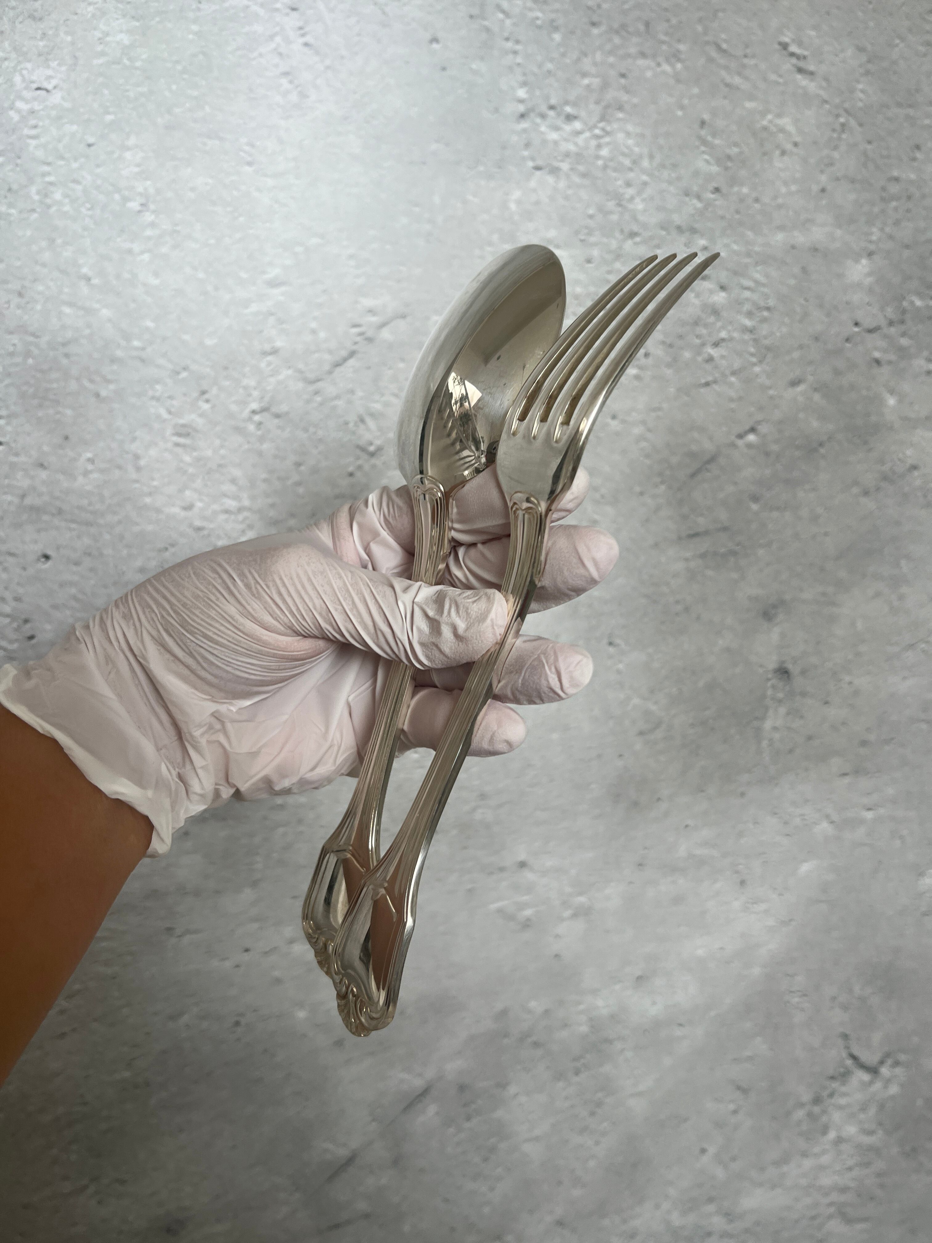 次はクリストフルのテーブルスプーンとフォークのご案内です。廃盤となっているポートロイヤルのシリーズを集めていて、海外よりまとまった本数を取り寄せたのですがこのサイズは食事に使いにくいと思いましたため、自宅利用分を除く余剰ストックをサービング用としてご提案します。※お届けのものはうちでは未使用のものとなりますが、利用感のあるブロカントです。シルバープレートなので使っていると黒ずんできます。以下詳細です。