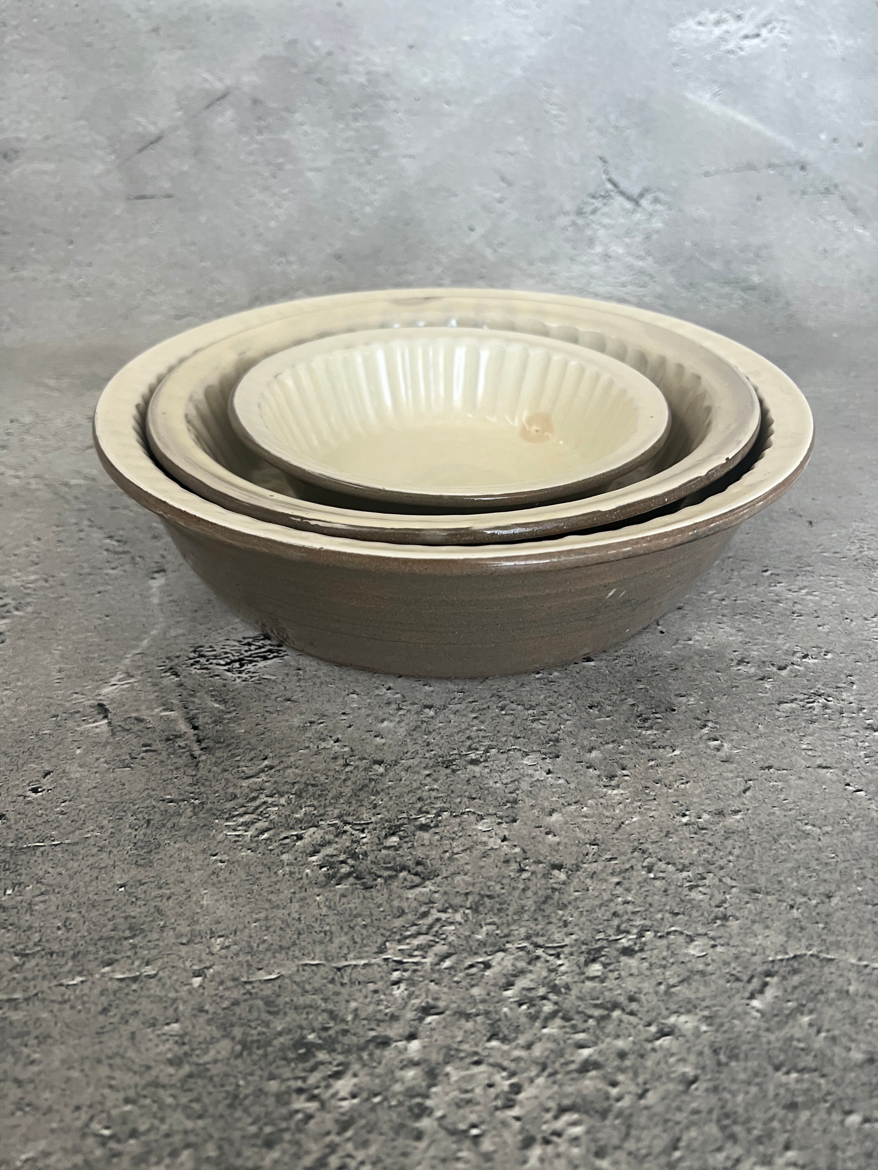 【商品詳細】入れ子になる益子焼シノギ鉢の3点セットです。目止めして使い始めていたと思うのですが、中小サイズと表面に利用感があります。